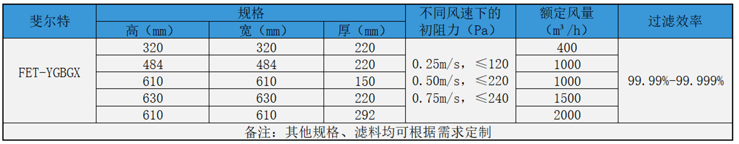 過濾等級 H13/H14(EN1822標(biāo)準(zhǔn)),過濾效率 99.95%-99.995%@0.3μm,初阻力 ≤220Pa,容塵量 ≥450g/m2,適用溫度 -30℃~80℃,框架材質(zhì) 防潮木框/可選鍍鋅板或鋁合金等。